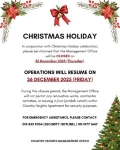 NoticeImportant notices not to be missed. Public holiday Announcement Read More » 17/12/2025 No Comments Christmas & New year safety tips Read More » 17/12/2025 No Comments election day sabah 2025 Read More » 28/11/2025 No Comments BULKY ITEM NOTICE Read More » 13/06/2023 No Comments DIRECT ONLINE TRANSFER NOTICE Read More » 13/06/2023 No Comments HOUSE RENOVATION NOTICE Read More » 13/06/2023 No Comments MOVING OUT NOTICE Read More » 12/06/2023 No Comments INSTALLATION OF BALL-VALVE Read More » 07/06/2023 No Comments NO PARKING NOTICE Read More » 02/06/2023 No Comments NO PETS NOTICE Read More » 10/05/2023 No Comments OWNER REFUND DEPOSIT NOTICE Read More » 20/04/2023 No Comments